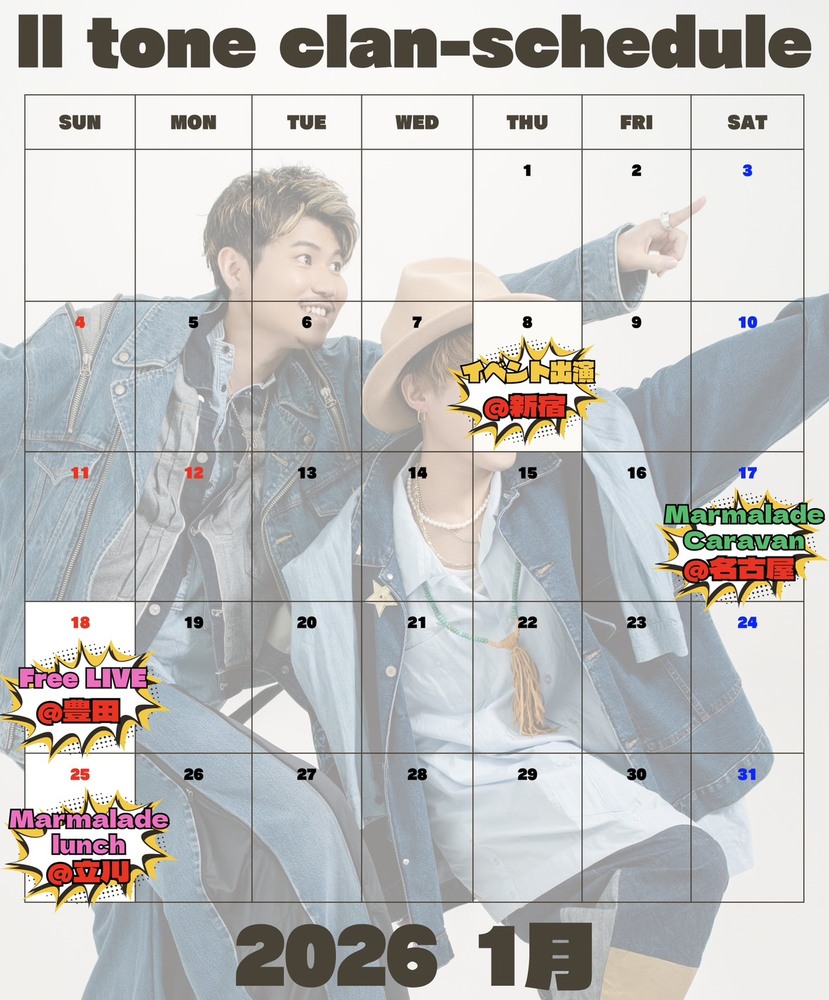 2026.1月スケジュール NEWS Ⅱ tone clan ツートンクラン Family Clan スケジュール 更新 2026 新年 Ⅱ tone clan Official Fanclub "Family Clan" 2025/12/17 17:30 フォロー 2026年1月のスケジュールを公開しました! URLをコピーする 報告する