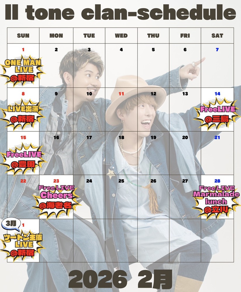 ※更新 2026.2月スケジュール NEWS Ⅱ tone clan ツートンクラン Family Clan スケジュール 更新 2026 Ⅱ tone clan Official Fanclub "Family Clan" 2026/01/27 17:33 フォロー 2月のスケジュールを更新しました! URLをコピーする 報告する