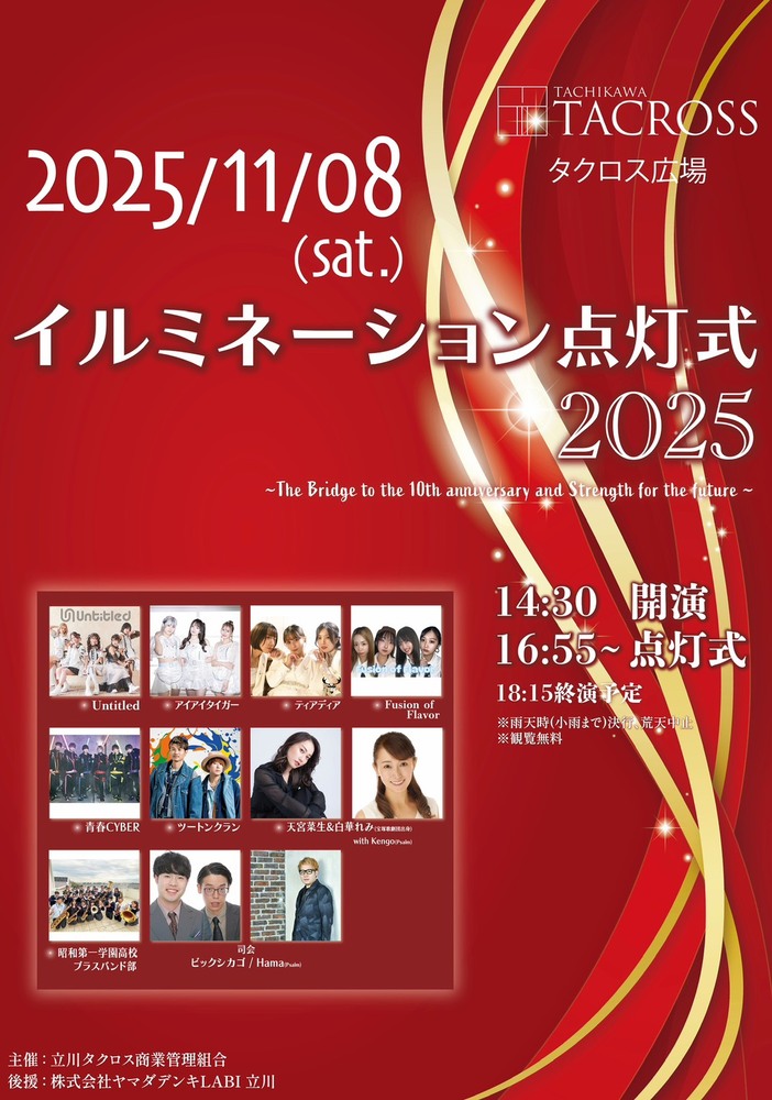 立川タクロス イルミネーション点灯式2025 SCHEDULE 2025/11/08(土) ツートンクランの主催野外フリーイベントでも使わせていただいている「立川タクロス広場」で開催されるイルミネーション点灯式に出演します!! 観覧は無料です! ご来場をお待ちしております🦧 URLをコピーする 報告する